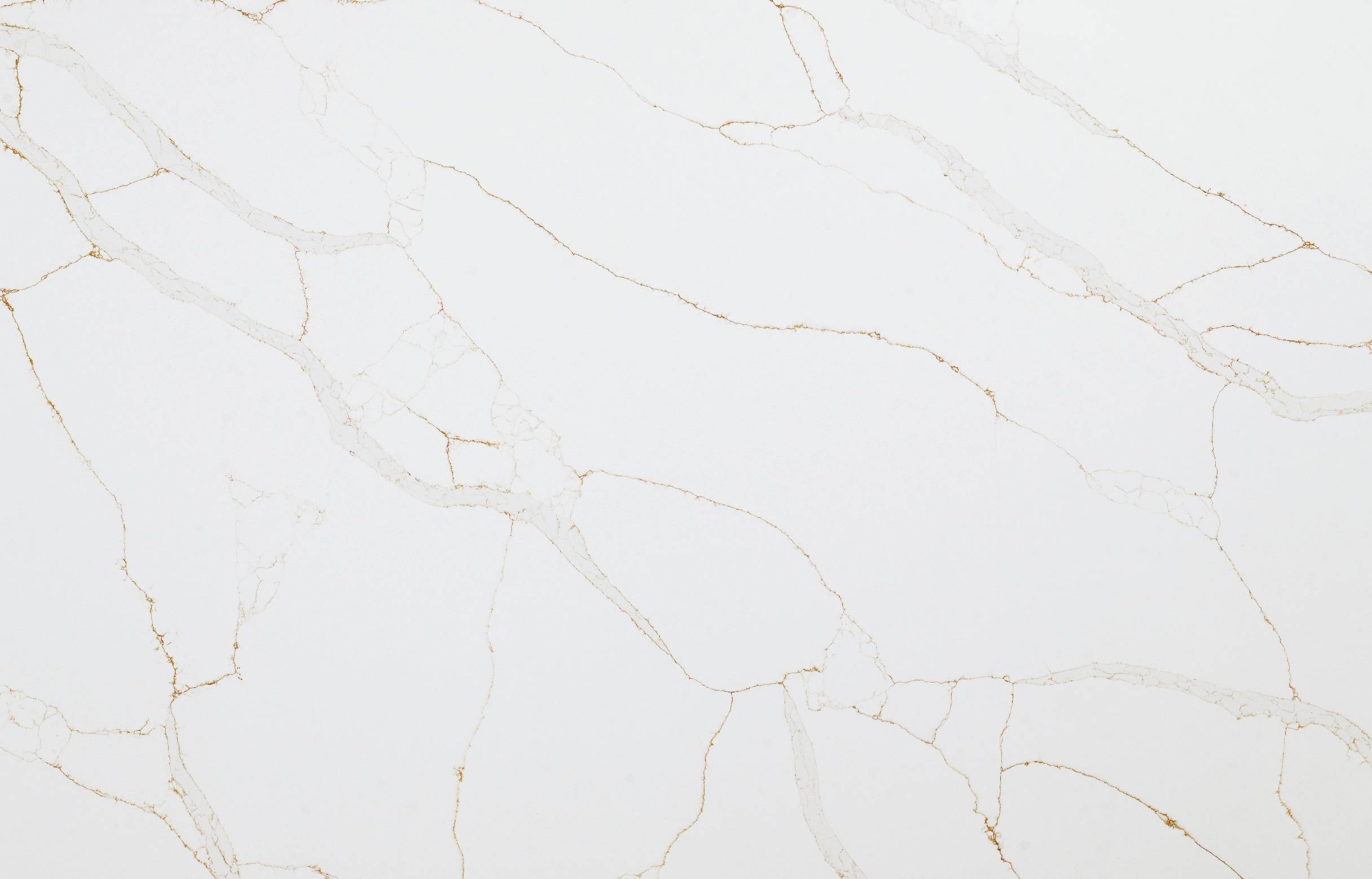 This luxurious slab features a brilliant white background accented by dramatic, sweeping gold and gray veining. Its substantial beauty is ideal for creating a refined and elegant look, offering a resilient and stylish surface for any kitchen or bathroom space.