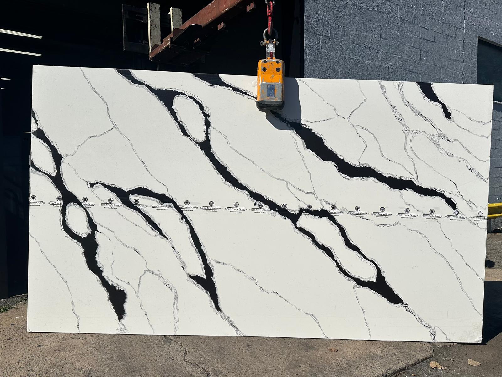 This material features a striking contrast of brilliant white and bold black veins, creating a dramatic, art-inspired surface perfect for sophisticated and modern kitchen designs. Its polished finish enhances the clarity and depth of its movement.